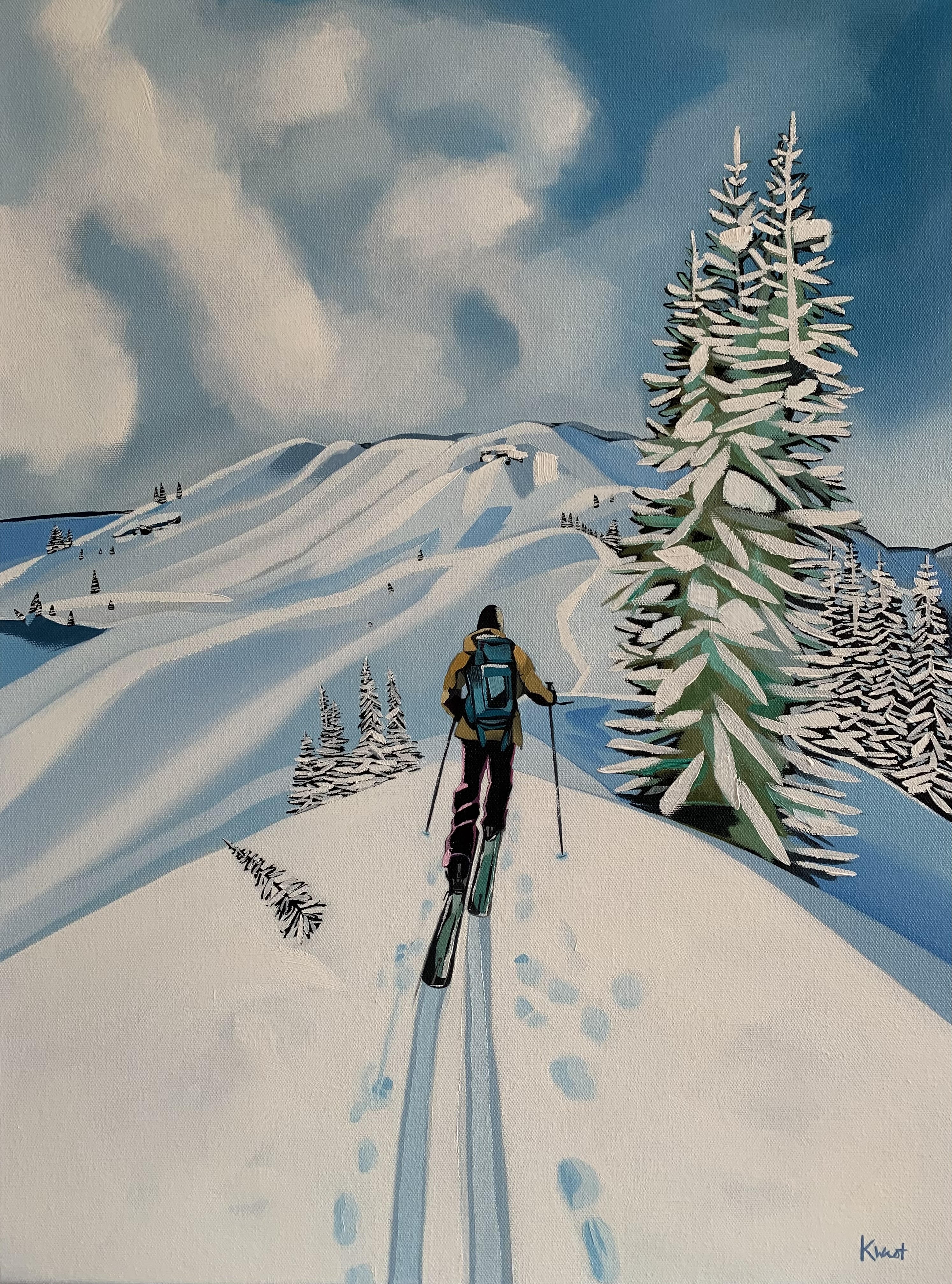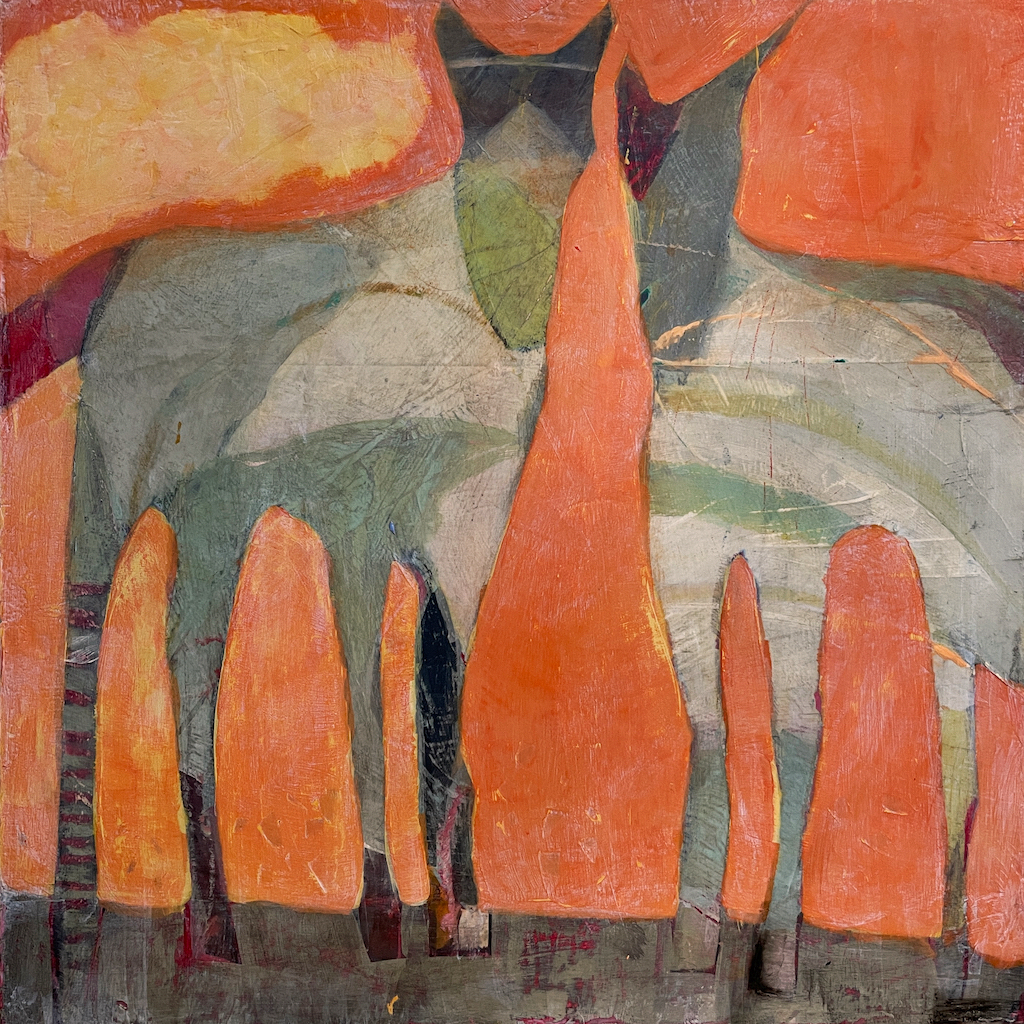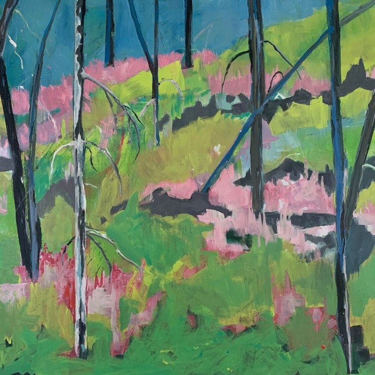 Gina Garlie-“I am a contemporary artist incorporating impressionist styles, whimsy, and spiritual wanderings. I live in NW Montana and often paint on site or begin with a drawing or photograph to finish back in my home studio using oil, acrylic, or mixed media. My paintings reflect my deep care and connection to the earth, as well as, inspire the viewer to pause and look deeply, feel the textures, and remember our connections to all things. Whether you are walking along a path, sitting deep in a forest, gazing over a meadow towards a mountain range far beyond, or stumbling upon an orchid hidden in the
